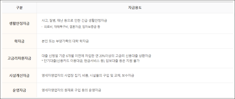 보통 생활안정자금 및 학자금 용도로 신청하는 것이 일반적입니다.