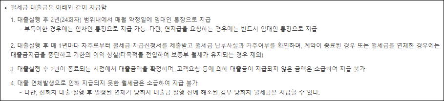 대출실행 후 매 1년마다 대출 신청인으로부터 월세금 지급 신청서를 제출받고 월세금 납부사실과 거주여부를 확인하며, 계약이 종료된 경우 또는 월세금을 연체한 경우에는 대출금 지급을 중단하니 유의바랍니다.