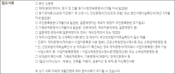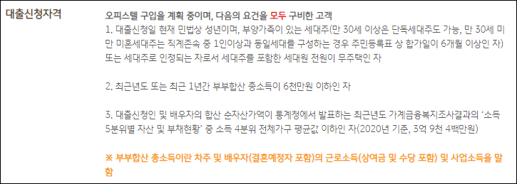 - 대출 신청일 현재 민법상 성년이면서 부양가족이 있는 세대주 (만 30세 이상 단독세대주도 가능) 또는 세대주로 인정되는 자로서 세대주를 포함한 세대원 전원이 무주택인 가구