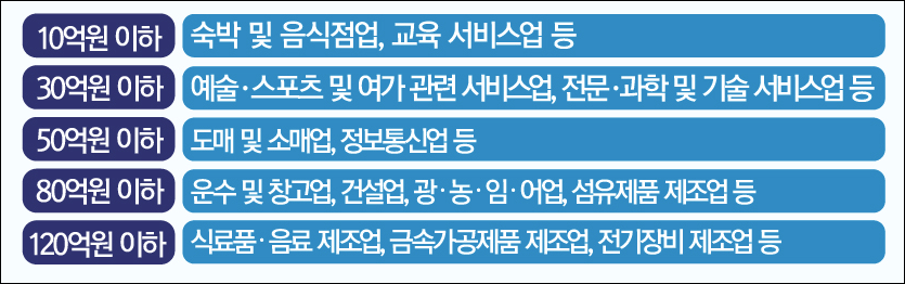 숙박 및 음식점업, 교육 서비스업 등은 연매출이 10억원 이하인 경우 지원 대상이 됩니다.