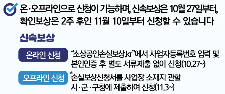 방문하여 신청을 원하는 경우 11월 3일부터 손실소상신청서를 사업장 소재지 관한 시,군,구청에 제출하여 신청하시면 됩니다.