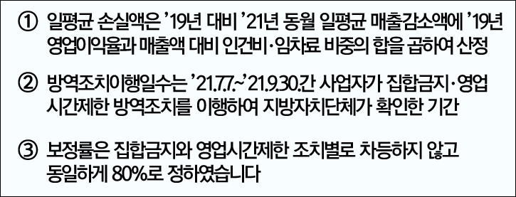 일평균 손실액은 19년 대비 21년 동월 일평균 매출감소액에 19년 영업이익률과 매출액 대비 인건비, 임차료 비중의 합을 곱하여 산정합니다.