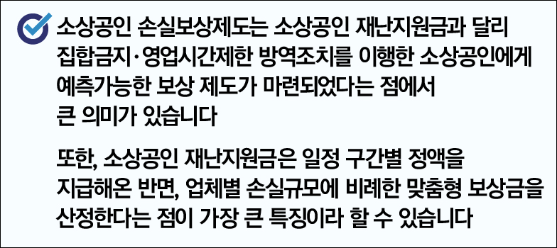 피해 소상공인 및 업체별 손실규모에 따라 맞춤형 보상금을 산정한다는 점이 재난지원금과는 다른 특징이라고 할 수 있습니다.