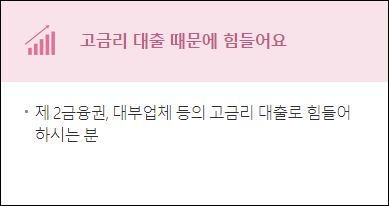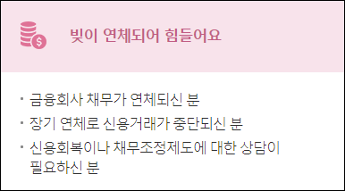 제 2금융 및 대부업체 등의 고금리 대출로 힘들어 대환대출이 필요하신 분, 그리고 금융회사 채무로 연체되신 분, 장기 연체로 신용거래가 중단된 분, 신용회복이나 채무조정제도에 대한 상담이 필요하신 분도 이용할 수 있습니다.