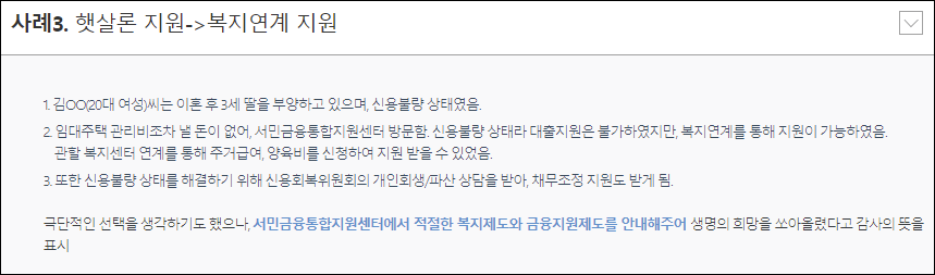 위의 사례는 민원인이 신용불량상태라 대출지원을 받을 수는 없었지만 복지연계를 통해 주거급여와 양육비를 신청하여 지원받을 수 있었던 분의 이용사례입니다.