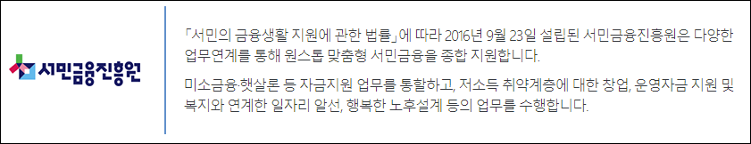 서민금융진흥원 : 서민금융진흥원은 서민의 금융생활지원에 관한 법률에 따라 2016년 9월 23일 설립되었습니다.