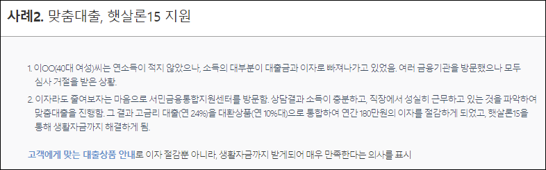 위의 사례는 과도한 대출이자가 부담스러워 대출 이자를 줄이고자 서민금융통합지원센터를 방문하였고 고금리 대출을 대환상품으로 대환하여 연간 180만원의 이자를 절감하고 햇살론15를 통해 생활자금까지 지원받은 분의 이용사례입니다.