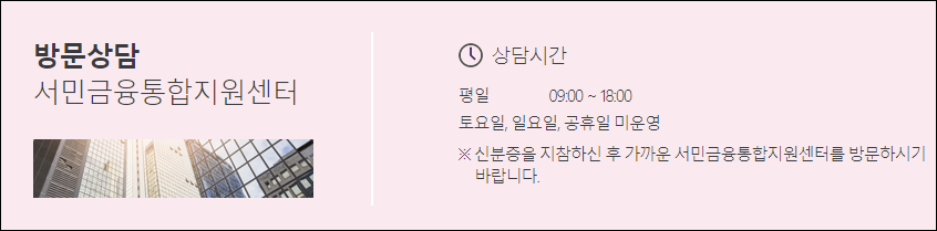 그 이후 필요시 서민금융통합지원센터 방문 예약을 한 이후 신분증을 지참하고 가까운 지부로 방문하시면 됩니다.