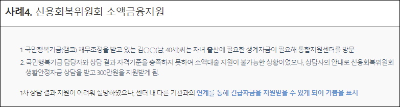 위의 사례는 채무조정 지원을 받고 있는 와중에 긴급자금이 필요하여 여기저기 알아보았지만 대출을 받지 못하고 서민금융통합지원센터에 방문하였는데 신용회복위원회의 소액금융 지원제도를 통해 긴급자금을 마련한 분의 이용사례입니다.