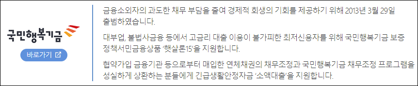 국민행복기금 : 금융소외자의 과도한 채무부담을 줄여 경제적 회생의 기회를 제공하기 위해 2013년 3월 29일 출범하였고 대부업 및 불법사금융 등에서 고금리 대출을 이용하고 있는 최저신용자를 정책서민금융상품 등을 통해 금융권 대출상품을 이용할 수 있도록 지원하고 있습니다.