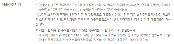 부부합산 연소득이 7천만원 이상이거나 2주택 이상 보유중이신 분은 본 대출 상품을 신청할 수 없으니 아래의 대출상품을 참고하시길 바랍니다.