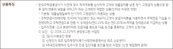 국민은행 주택담보대출은 한국주택금융공사가 사전에 양수 적격여부를 심사하여 주택담보대출의 금리를 낮춘 장기 고정금리 상품으로 향후 금리 변동의 위험을 피하고자 하는 분에게 적합한 상품입니다.