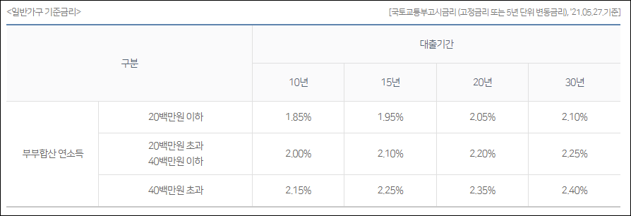 부부합산 연소득이 적으면 적을 수록, 대출기간이 짧으면 짧을 수록 대출금리는 낮아집니다.
