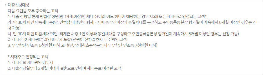 대출 신청일 현재 만19세 이상인 세대주 또는 세대주로 인정되는 분이 아래의 요건을 모두 충족하면 대출 신청이 가능합니다.