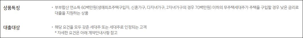 예외적으로 생애최초 주택구입자의 경우 부부합산 연소득 7000만원 이하인 경우 대출 지원대상이 됩니다.