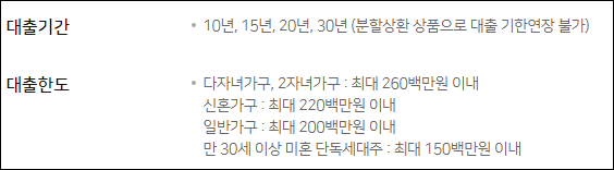 대출기간은 10년, 15년, 20년, 30년 중 하나를 신청인이 선택하여 약정할 수 있으며, 한번 결정한 대출 기간은 변경하거나 연장할 수 없으니 신중히 결정하시길 바랍니다.