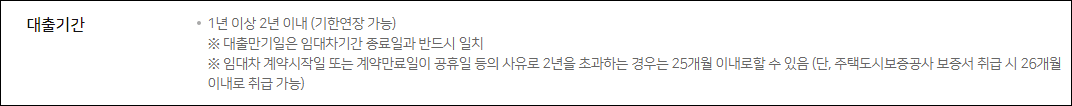 대출만기일과 임대차 계약 종료일은 반드시 일치해야하며, 임대차 계약 시작일 또는 계약만료일이 공휴일등의 사유로 2년을 초과하는 경우 25개월 이내로 대출기간이 약정될 수 있습니다.