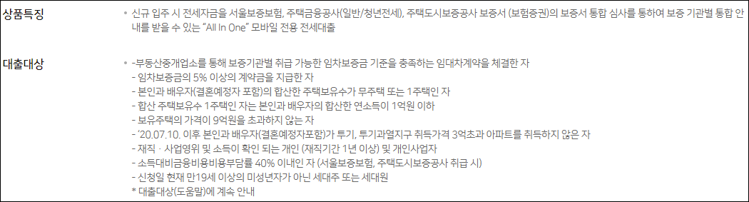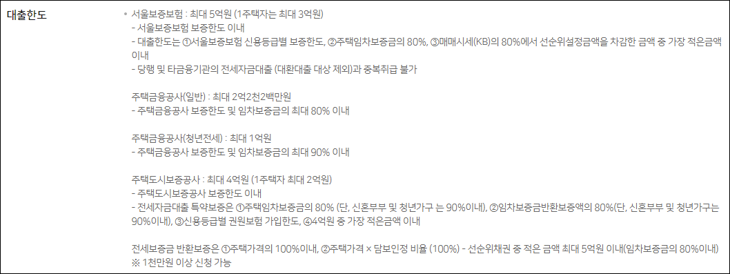 - 서울보증보험 : 최대 5억원, 1주택 보유자는 최대 3억원