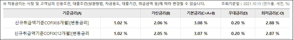 기준 금리는 신청시기의 시장금리에 따라 달라질 수 있으며, 가산금리와 우대금리는 신청인의 대출조건 등에 따라 달라질 수 있습니다.