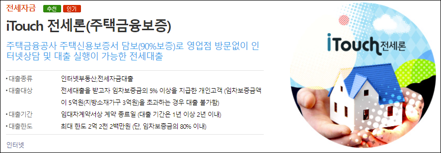 주택금융공사 주택신용보증서를 담보로 영업점 방문없이 인터넷으로 상담 및 대출 신청이 가능한 전세자금대출이 있습니다.