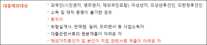 위의 조건을 충족하더라도 아래의 대출제한 대상에 해당한다면 대출신청이 제한될 수 있으니 유의바랍니다.