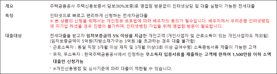 우리은행 전세자금대출은 주택금융공사 주택신용보증서를 담보로 영업점 방문없이 간편하게 상담 및 대출 신청이 가능한 전세자금 대출입니다.
