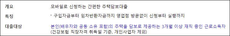 구입자금부터 임차반환자금까지 영업점 방문없이 모바일로 간편하게 신청할 수 있는 것이 특징입니다.