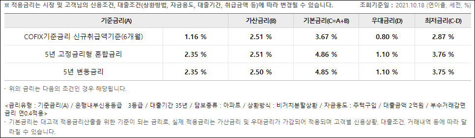 기준금리는 신청시기의 시장금리에 따라 달라질 수 있으며, 가산금리와 우대금리는 신청인의 대출조건 등에 따라 달라질 수 있습니다.