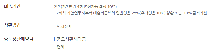 대출기간은 2년이며, 만기전 연장신청을 통해 2년 단위로 4회 연장하여 최장 10년간 이용할 수 있습니다.