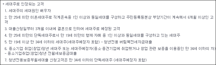 - 만 25세 미혼 세대주로 직계존족중 1인과 동일 세대를 구성하고 주민등록등본상 부양기간이 계속해서 6개월 이상인 분 대출 신청일부터 3개월 이내에 결혼으로 인하여 세대주로 예정된분