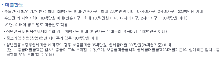 예외적으로 신혼가구의 경우에는 수도권 2억원, 비수도권 1억 6천만원, 다자녀가구의 경우 수도권 2억 2천만원, 비수도권 1억 8천만원까지 한도가 책정될 수 있습니다.