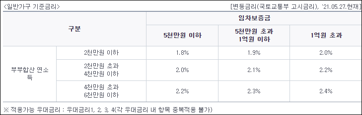 연간 최저 1.8%에서 최고 2.4%의 금리가 적용될 수 있으며, 신혼가구와 2자녀 이상 가구는 우대혜택을 받을 수 있습니다.