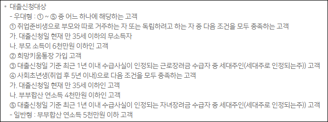 우대형 : 취업준비생, 희망키움통장 가입자, 근로장려금 수급자 중 세대주, 취업후 5년 이내인 만 35세 이하의 세대주
