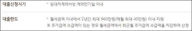 국민은행 주거안정 월세대출은 월세금액 이내에서 2년간 최대 960만원 이내까지 한도가 책정됩니다.
