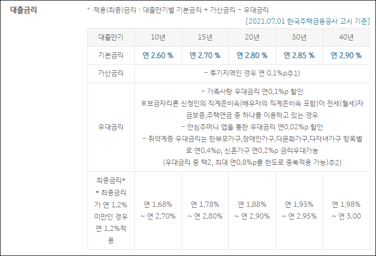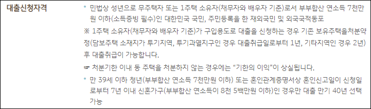 만 39세 이하 또는 혼인신고일로부터 7년 미만인 신혼가구는 예외적으로 대출기간을 40년까지 약정할 수 있으니 참고하시길 바랍니다.