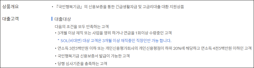 국민행복기금의 보증서를 담보로 1금융권 대출 상품을 이용하기 어려운 저신용 계층에게 2금융권 및 대부업 등의 대출보다 낮은 금리로 긴급생활자금을 지원하는 정부지원 서민금융 상품이 있습니다.
