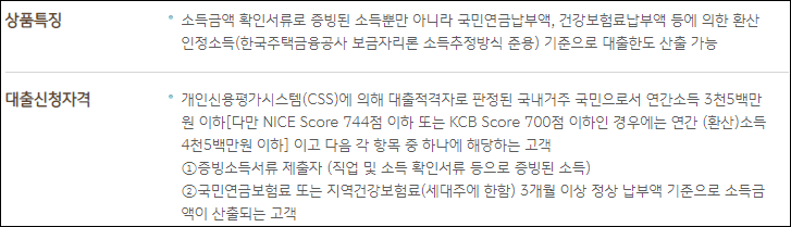국민은행 새희망홀씨는 정부지원 서민금융 상품으로 소득금액 확인서류로 증빙된 소득뿐만 아니라 국민연금납부액, 건강보험료 납부액 등에 의한 환산인정소득 기준으로도 대출한도가 산출 가능하다는 것이 특징입니다.