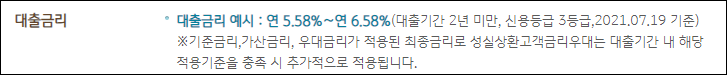 연간 5.58%에서 6.58%의 금리가 적용될 수 있지만 위의 금리는 예시일 뿐이며, 실제 금리는 신청시기 및 대출 조건 등에 따라 달라질 수 있으니 참고만 하시길 바랍니다.