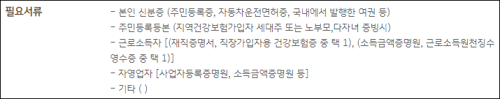 - 증빙소득서류 제출 : 재직확인서 및 근로소득원천징수영수증
