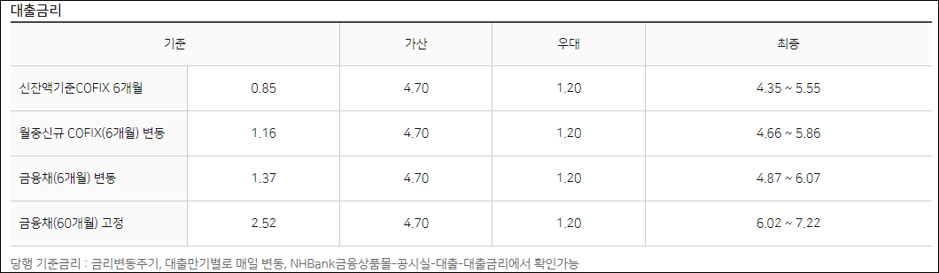 기준 금리는 신청시기의 시장금리에 따라 달라질 수 있으며, 가산금리와 우대금리는 신청인의 대출조건 등에 따라 달라지게 됩니다.