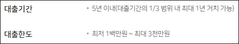 대출 기간은 5년으로 약정할 수 있으며, 대출기간의 30% 범위내에서 최대 1년간 이자만 납입하는 거치기간을 운용할 수 있습니다.