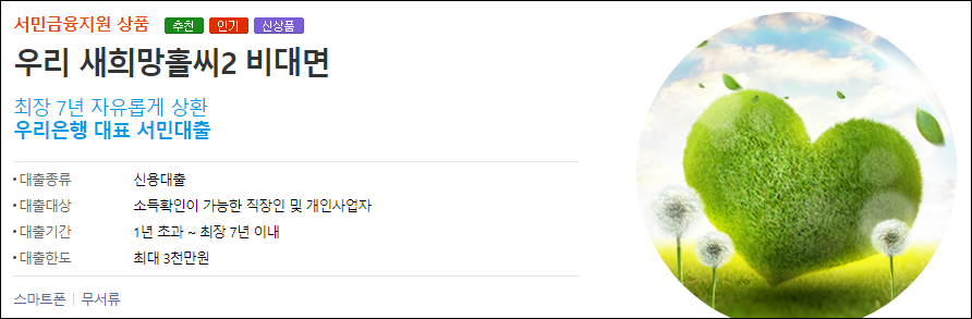 우리은행 새희망홀씨 대출은 서민금융 지원을 위한 우리은행의 대표적인 서민금융상품으로 최장 7년간 자유롭게 상환이 가능하고 직장인은 인터넷뱅킹 및 모바일을 통해 비대면으로 신청할 수 있다는 것이 특징입니다.