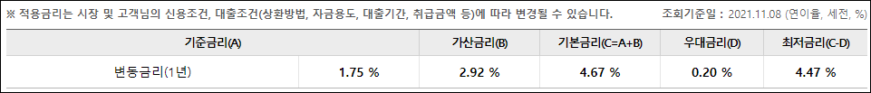 기준금리는 신청시기의 시장금리에 따라 다르게 책정될 수 있으며, 가산금리와 우대금리는 신청인의 대출조건 등에 따라 달라지게 됩니다.
