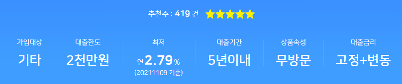 연간 2.79%의 금리부터 적용받을 수 있지만 신청인의 개인신용평점 및 대출조건에 따라 실제 금리는 달라질 수 있으니 참고만 하시길 바랍니다.
