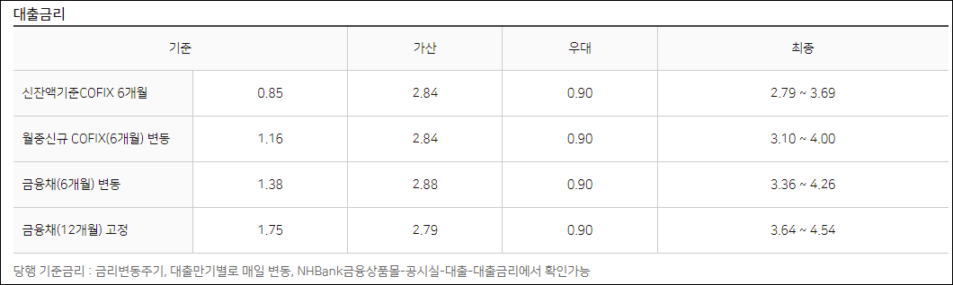 기준금리는 신청시기에 따라 달라질 수 있으며, 가산금리와 우대금리는 신청인의 신용등급 및 대출조건 등에 따라 달라질 수 있습니다.