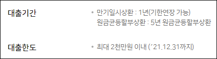 원금균등분할상환의 경우 최장 5년 이내에서 신청인이 대출기간을 선택할 수 있지만 이자만 납입하는 거치기간은 부여할 수 없고 대출 실행 이후에는 대출 상환기간을 연장 또는 변경할 수 없으니 신중히 결정하시길 바랍니다.