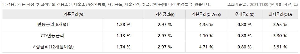 기준금리는 신청시기의 시장금리에 따라 달라질 수 있으며, 가산금리와 우대금리는 신청인의 신용등급 및 대출조건 등에 따라 다르게 결정됩니다.