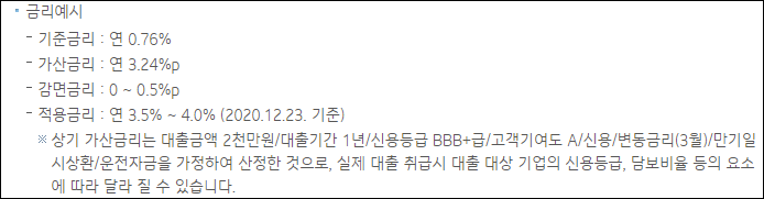 기준금리는 신청시기의 시장금리에 따라 달라질 수 있으며, 가산금리와 우대금리는 신청인의 신용등급 및 대출조건 등에 따라 달라지게 됩니다.