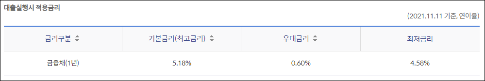 기준 금리는 신청시기의 시장금리에 따라 달라질 수 있으며, 가산금리와 우대금리는 신청인의 신용등급 및 연간소득 등에 따라 달라질 수 있습니다.