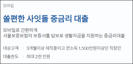 서울보증보험의 개인금융신용보험증 발급이 가능한 분이 다음의 요건을 모두 충족하면 대출신청이 가능합니다.